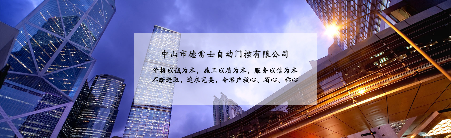 中山市德雷士自動門控有限公司代理中山松下自動門、中山松下感應(yīng)門、及其旗下品牌松下(Panasonic)自動門、旋轉(zhuǎn)門、型材門、松下門禁系統(tǒng)、地彈簧、閉門器等系列產(chǎn)品。 松下Panasonic一直致力于憑借不斷創(chuàng)新的技術(shù)營造為各個區(qū)域的用戶做出最佳解決方案,在自身領(lǐng)域處于領(lǐng)先地位;松下自動門控系統(tǒng)廣泛應(yīng)用于寫字樓、機(jī)關(guān)單位、大型企業(yè)、學(xué)校、醫(yī)院、智能小區(qū)等領(lǐng)域。在用戶心中有良好的口碑及信譽度。 松下(Panasonic)自動門控系統(tǒng)包含:自動感應(yīng)門、旋轉(zhuǎn)門、90度平開門、圓弧型門、重疊門、緊急逃生門、醫(yī)用門、氣密門、鋁合金型材門、松下門禁系統(tǒng)、家庭智能鎖、地彈簧、閉門器等系列產(chǎn)品。 德雷士自動門控有限公司從事智能門控十余載,精英匯聚;公司具有完善的管理體系,對每位客戶都進(jìn)行檔案管理,跟蹤服務(wù),定期回訪,終生維修。提供急修12小時解決,一般維修48小時解決的服務(wù),完全能解決您的后顧之憂。 公司的質(zhì)量方針 科學(xué)管理確保的工程質(zhì)量 真誠服務(wù)贏得客戶信譽 持續(xù)創(chuàng)新打造企業(yè) 公司的服務(wù)宗旨 價格以誠為本,施工以質(zhì)為本,服務(wù)以信為本。 實實在在做人,老老實實做事,以我們的辛苦換來客戶滿意的微笑,這就是我們的追求! 公司的目標(biāo) ...